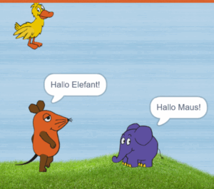 Am 30.10.2025 waren Grundschulkinder der Klassen 3 und 4 bei drei Programmierworkshops in Herbolzheim fleißig. Wir haben einen kleinen Trickfilm gestaltet, in welchem sich Maus und Elefant begegnen, begrüßen und eine Ente über sie hinwegfliegt.