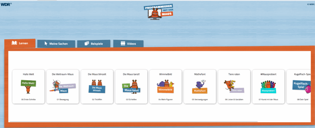 Sie können entweder die Seite https://programmieren.wdrmaus.de/ nutzen oder alternativ das Programm Scratch auf einem PC oder Androidgerät installieren: https://scratch.mit.edu/download. In letzterem Fall sind die Figuren unterschiedlich.